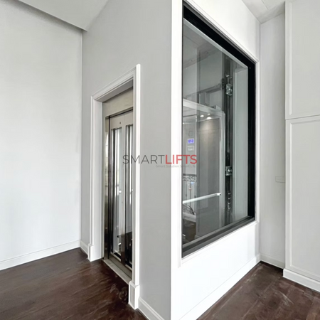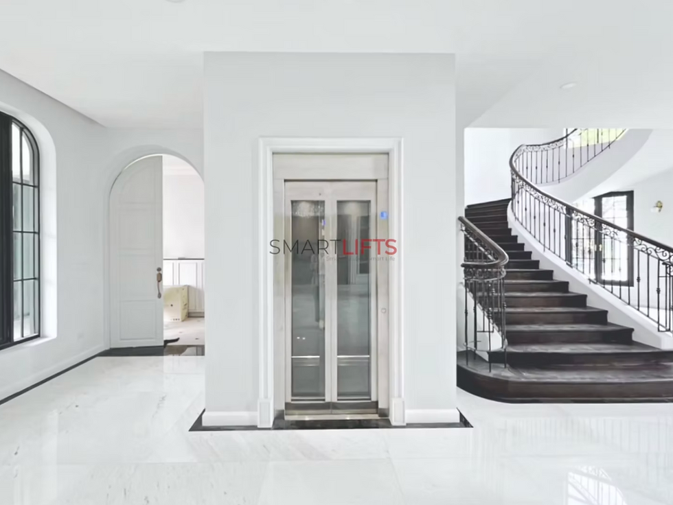 ลิฟต์บ้านระบบไฮดรอลิก นำเข้าจากประเทศอิตาลี ติดตั้งภายในบ้านสูง 2 ชั้น ย่านบางพลี ลูกค้าเลือกประตูเป็น Auto Sliding Door ประตูทั้ง 2 บานเป็นกระจกเพื่อทำให้มองเห็นภายลิฟต์ได้อย่างชัดเจน ปล่องลิฟต์ออกแบบเป็นกระจกและตัวลิฟต์ตกแต่งด้วยสีเข้มทำให้ตัดกับบ้านสีขาวได้อย่างสวยงาม