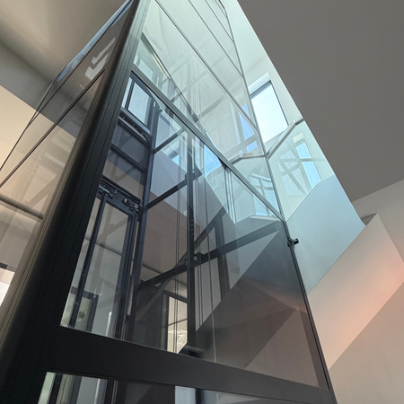 โปรเจกต์นี้ตัวลิฟต์กระจกใสโปร่งรอบด้าน 360 องศา ดีไซน์ Minimal เข้ากับโถงบันไดกลางบ้านได้อย่างลงตัว เรียบหรู ทันสมัย ช่วยให้บ้านดูโปร่งกว้าง ตอบโจทย์การใช้งานครอบคลุมทุกชั้น พร้อมความปลอดภัยมาตรฐานสากล